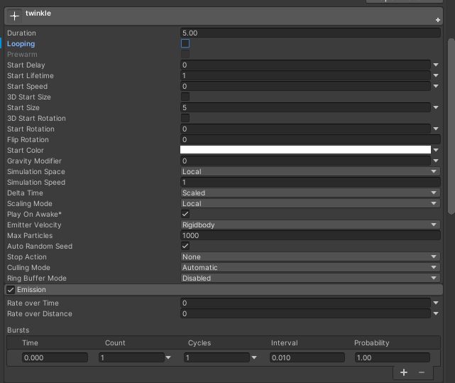 同样地,在爆炸发生时才会生成球型光雨。我们的要求是,在时间上考虑效率的情况下(或为了效率),我们将其设置为零。相比之下,在这种模式下(或在这种模式中),我们选择使用Bursts模式来实现高效的粒子释放效果。与twinkle不同,在每次生成时会释放大量粒子,并且count的数量设置为1,000(即每个爆炸都会发射1,