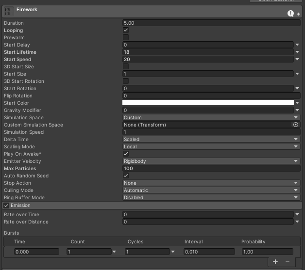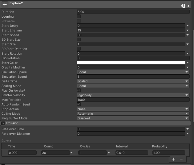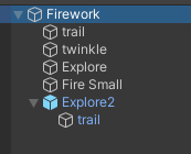 Firework主体的作用仅限于为烟花提供动力运动。因此不会生成任何粒子。各种粒子效果将由上文所述的各个组件部分完成。