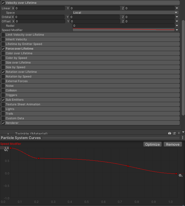 在已经介绍过的Birth阶段之外,在粒子完成消亡过程时才会触发的事件中可以看出:当粒子完成消亡过程时(即死亡事件触发时),我们的Twinkle、Explore以及Explore2这三个效果将会同时呈现出来;这种现象表现为烟花以爆炸的方式绽放;