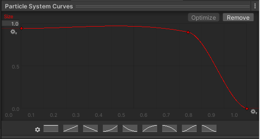 动态调节粒子尺寸:打开trail的粒子系统设置界面,在工具栏中找到并勾选[Size Over Lifetime]选项。随后,在界面下方绘制粒子大小随运动时间变化的趋势图以完成参数设置