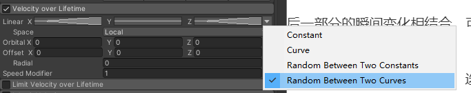 在Trail的粒子系统中配置粒子运动参数:首先,在 trail 的粒子系统面板中打开设置界面;其次,在界面中找到 Velocity over lifetime 选项并勾选;最后,在速度变化方式的选择框中将 Velocity over lifetime 设置为 Random between two curves