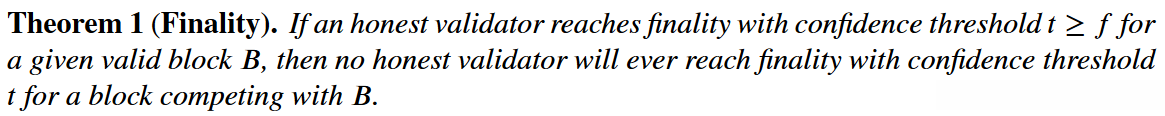 也就是说当一个区块B以置信度值t>f(f为终结性阈值)达到终结时,诚实节点不能让其他与B竞争的区块以置信度t达到终结。