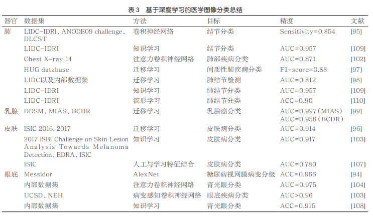 从临床应用的角度来看,图像分类与图像目标识别被视为医学影像分析的核心任务。这也是当前人工智能技术与临床医学深度结合的主要研究领域。本文主要探讨了分类识别的关键方法及其应用前景。表3系统地列出了肿瘤分类中常用的医学图像数据集及其对应的深度学习模型,并对它们的分类性能进行了详细对比分析。