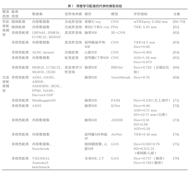 图像配准涉及对不同时间点和不同设备获取的影像数据进行空间位置匹配的操作,在医学影像处理领域具有关键性作用作为预处理步骤之一。该过程广泛应用于多个领域如医学影像融合分析、疾病谱构建、手术导航以及肿瘤定位等研究中。目前深度学习在医学影像配准领域的研究可划分为三类:一类是基于深度迭代算法的方法;另一类是采用监督型深度学习模型;第三类则是以无监督模型为基础的技术体系。第一类方法主要通过深度学习模型建立相似性度量标准并配合传统优化手段实现变形校正但因其运算效率较低而未能充分展现深度学习的优势近年来相关报道较少本文则着重探讨了基于有监督和无监督学习的学习机制及其应用前景