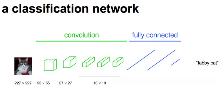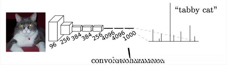 输入AlexNet, 得到一个长为1000的输出向量, 表示输入图像属于每一类的概率, 其中在“tabby cat”这一类统计概率最高。