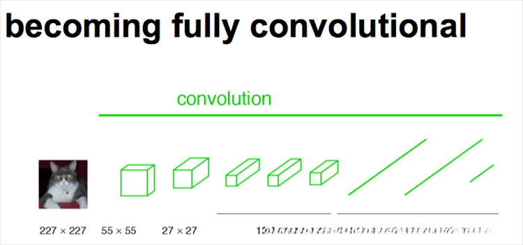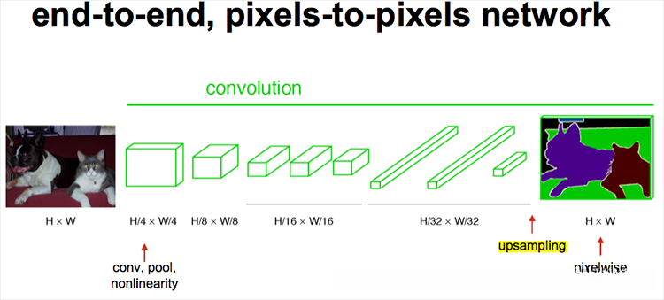 经过多次卷积和pooling以后,得到的图像越来越小,分辨率越来越低。其中图像到 H/32∗W/32 的时候图片是最小的一层时,所产生图叫做heatmap热图,热图就是我们最重要的高维特诊图,得到高维特征的heatmap之后就是最重要的一步也是最后的一步对原图像进行upsampling,把图像进行放大、放大、放大,到原图像的大小。