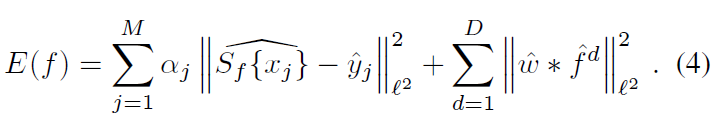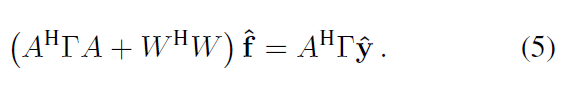 由于滤波器f被限制成许多受限定的非零傅里叶系数,(9)式是线性最小二乘问题。对应的标准方程与(5)式部分结构相似,增加的部分对应于矩阵增量