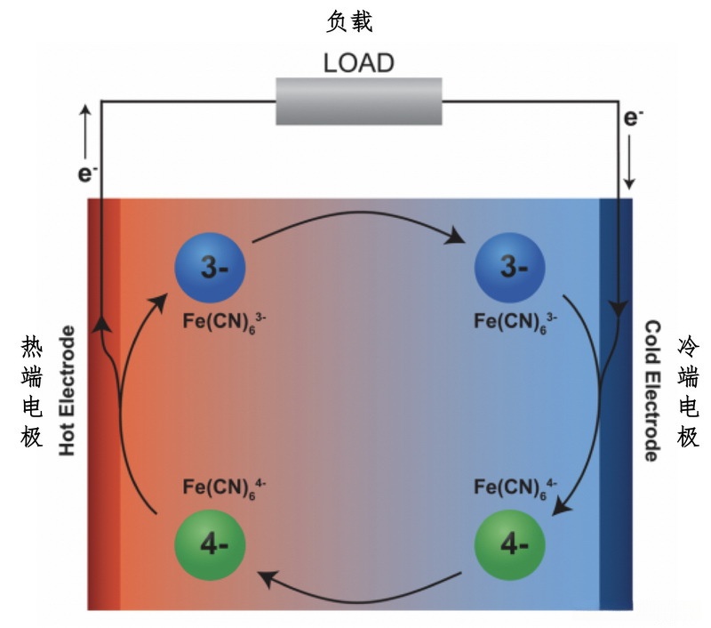 温差发电技术在固体材料领域以及半导体领域的应用和发展已经较为成熟。然而,在过去几年中逐渐崭露头角的一项创新性电化学热电池技术(Electrochemical Thermocells)因其更高的塞贝克系数而备受关注,并且其成本较低且能够适应复杂的热源表面特性也为其带来了广阔的前景。这些电化学热电池技术正成为当前研究的一个重点方向之一。基于此,在图1所示的基本原理框架下:这种电化学热电池技术是通过电化学体系中的塞贝克效应将冷热电极之间的温差直接转化为电势差从而实现发电效果;因此具备稳定的温度环境条件是使用和评价此类电化学电池的关键因素之一。