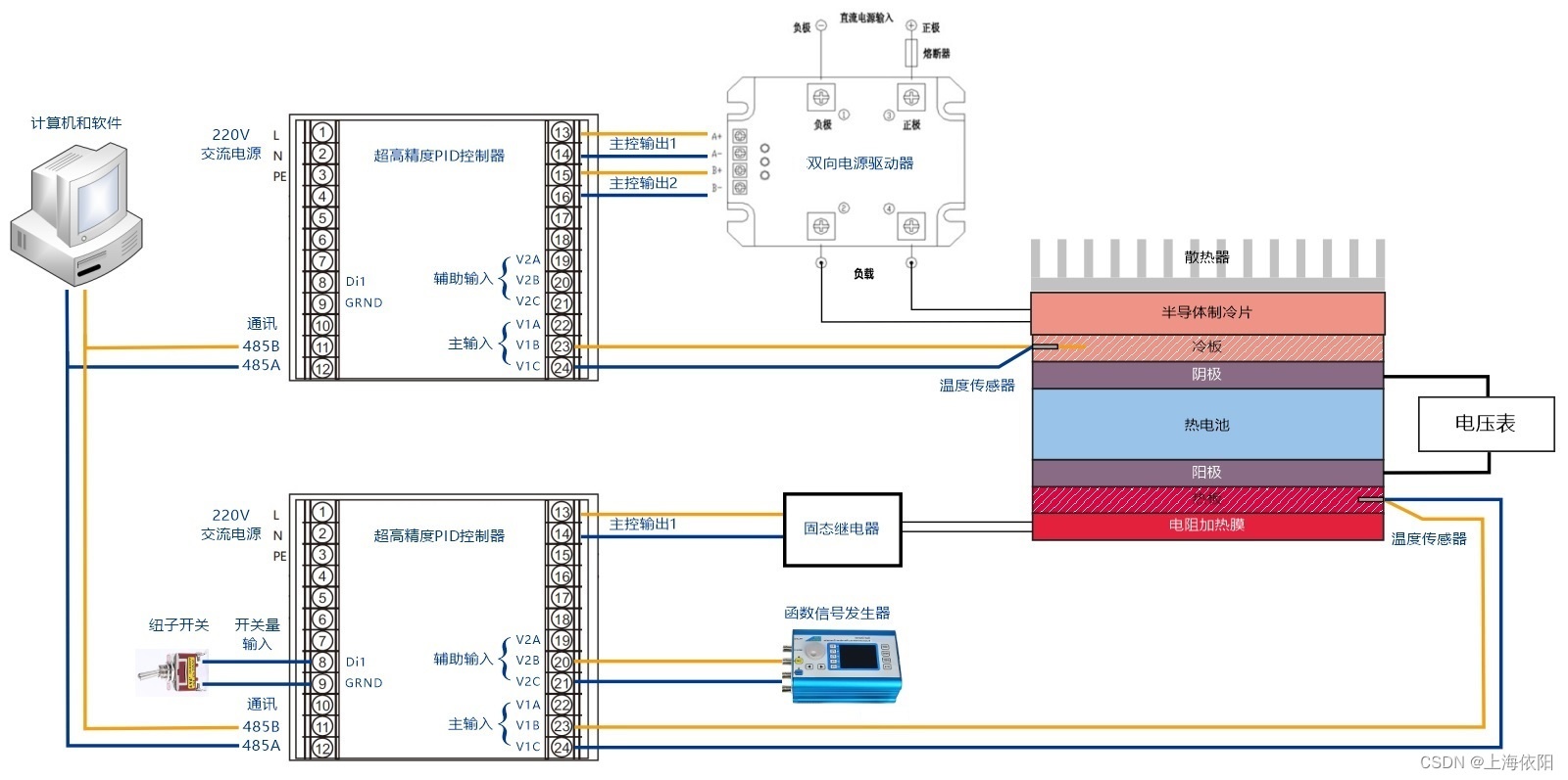根据上述功能需求可以看出,在电化学热电池性能测试过程中对温度及温差的变化有着较高的要求。具体而言,则是需要相关设备必须具备精确度高、可编程性以及周期性调制等功能。然而这些多数功能目前仍无法实现于现有的电化学热电池性能测试装置中。为此部分文章着重介绍了一种新型超精确多功能PID调控装置,并对其在电化学热电池特性测试中的温度控制系统进行了详细阐述。