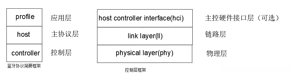 上图的蓝牙协议简要框架符合所有的蓝牙设备框架,其中抛去应用层以及主协议层这种纯软件相关层不说,控制层是与硬件相关的,这里简要说一下控制层的构成,phy层主要代表的是无线射频相关、ll层主要是控制重传数据摘取的功能、hci是可选层这是因为有的架构主协议层和控制层是集成的,这时候就不需要hci层作为信息传递通道,而有的架构控制层和协议层是分离的比如说mcu+rf_module这种架构,这个时候就需要hci层的存在;