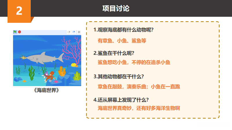 内容导入本次课程内容围绕"海底世界"展开。通过引导思考的方式,请小朋友们探讨其中包含的各种生物及其生态特征,并关注它们各自的角色与行为。