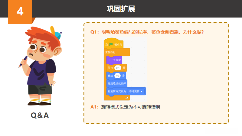 - 角色代码:为选定的角色添加一系列积木模块,在"小绿旗被点击"事件下执行"向前进10步""碰到边界后反弹"等指令,并设置角色旋转方向为左右翻转以实现小鱼形态的变化。