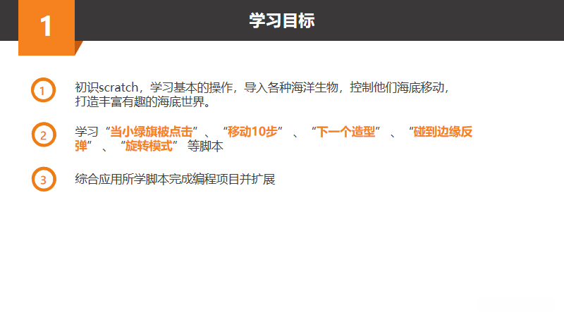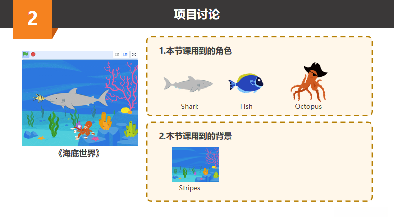 - 角色与背景:在Scratch中创建角色与背景,并将海底世界相关的动物形象与海底景观加入到场景中。