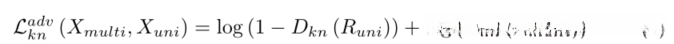 鉴于高层表示蕴含着更为丰富的信息内容,在潜在空间中实现特征分布的对齐这一目标时有其必要性。然而,在仅通过最小化两个关键路径上瓶颈特征间的KL发散度{Rmulti, Runi}来规避深层干扰单峰路径这一策略时也存在明显局限性:这种被动应对的方式容易使生成器Gkn陷入陷入单峰路径的风险。基于此背景要求我们引入一种更具前瞻性的机制:通过设计一个知识对抗模块来促进两种不同路径上高级特征表示间的对齐工作;与EnA模型类似地采用生成器Gkn试图误导另一个鉴别器Dkn这一思路相呼应地该目标函数的形式得以得以体现