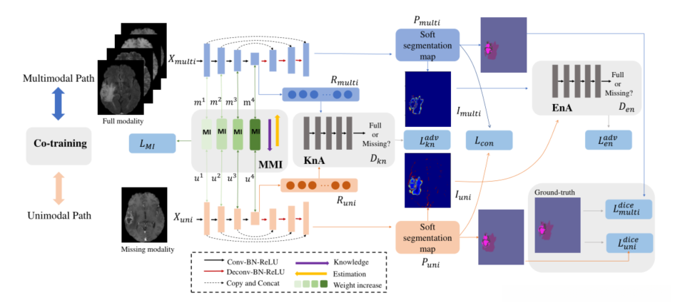 在此研究中, 我们开发出一种新型对抗联合训练网络模型, 主要针对大脑肿瘤分割中的特征缺失问题. 此外, 为了实现这一目标, 我们设计了两个无监督对抗学习机制用于同步完整模态与不完整模态间的域以及特征特性. 同时, 在同步过程中融入了模态互信息损失项, 这有助于提升模型对缺少知识的适应能力.