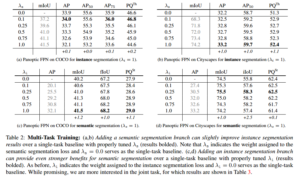 表中,ResNet-50-FPN 的结果表明,使用一个简单的语义分割损失λs,或实例分割损失λi,结果可以改善单任务 baseline 的结果。具体来说,适当地添加一个语义分割分支λs 能改进实例分割,反之亦然。这可以用来改进单任务结果。然而,我们的主要目标是同时解决这两个任务,这将在下一节讨论。