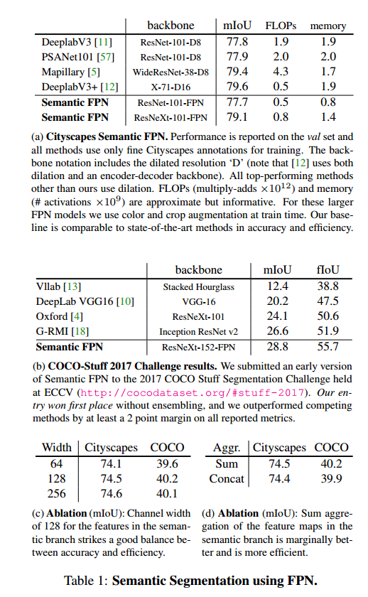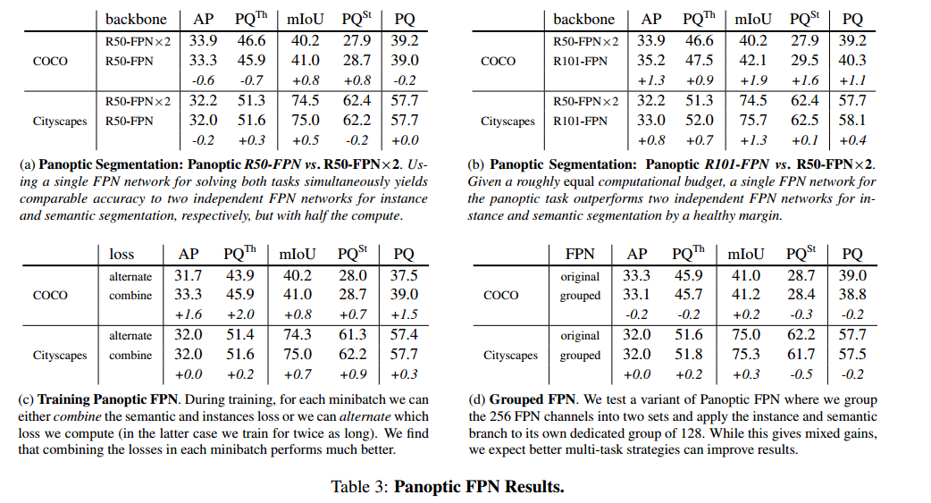 主要结果:在表 3a 中,我们比较了使用相同骨架的 Panoptic FPN 分别训练的两个网络。Panoptic FPN 具有相当的性能,但只需要一半的计算量。