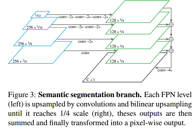 - 3 虽然 FPN 是为目标检测而设计的,但是这些要求——高分辨率、丰富的、多尺度的特征——正好是 FPN 的特征。因此,我们建议在 FPN 上附加一个简单而快速的语义分割分支。