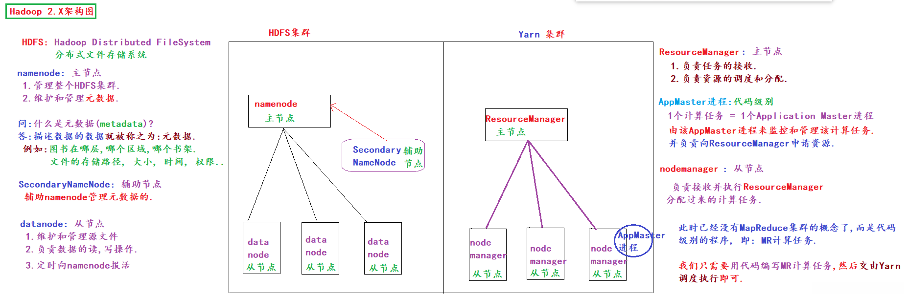 Hadoop 2.x 3.x = HDFS + MapReduce + Yarn