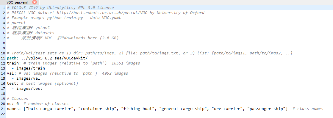 在data目录下新建一个VOC_sea.yaml文件,写入内容如下:
