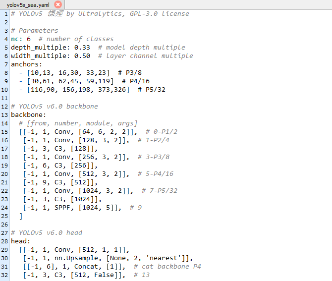 在models目录中创建一个yolov5s_sea.yaml文件,并填写其中的内容(根据需求选择yolov5s、yolov5l、yolov5m、yolov5n或yolov5x)