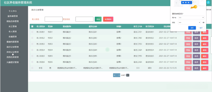 医生点击进入到系统操作界面,可以对个人中心、老人管理、亲属管理、健康档案管理、就诊记录管理、体检记录管理、用药信息管理、兴趣爱好管理等功能模块,