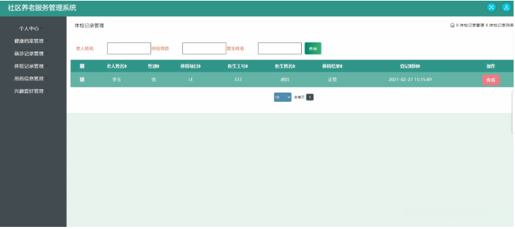 体检记录管理:通过列表可以获取老人姓名、性别、体检项目、医生工号、医生姓名、体检结果、登记时间等信息,进行查看操作,如图5-5所示。