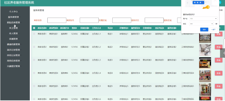 社区点击进入到系统操作界面,可以对个人中心、服务商管理、医院信息管理、员工管理、老人管理、亲属管理、健康档案管理、就诊记录管理、体检记录管理、用药信息管理、兴趣爱好管理等功能模块,