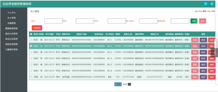 老人管理:通过列表可以获取姓名、性别、出生日期、学历、家庭住址、身份证号码、联系电话、老人姓名、密码、联系方式、服务类型、身份证号、居住情况、服务状态、区域等信息,进行查看操作,如图5-3所示。