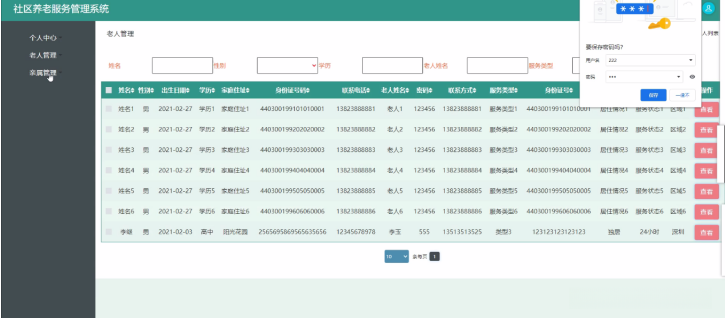 老人管理:通过列表可以获取姓名、性别、出生日期、学历、家庭住址、身份证号码、联系电话、老人姓名、密码、联系方式、服务类型、身份证号、居住情况、服务状态、区域等信息并进行查看操作,如图5-12所示。