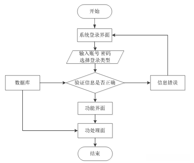 用户想进入系统,首先进入系统登录界面,通过正确的用户名、密码,选择登录类型登录,系统会检查登录信息,信息正确,然后输入相应的功能界面,提示信息错误,登录失败。系统操作流程如图3-4所示。