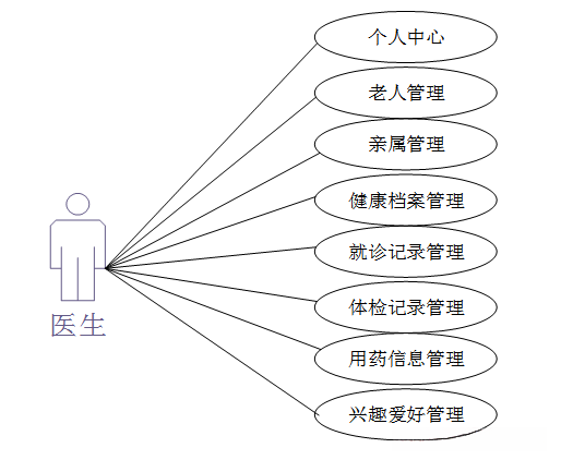 医生注册登录后可进行个人中心、老人管理、亲属管理、健康档案管理、就诊记录管理、体检记录管理、用药信息管理、兴趣爱好管理,医生用例如图3-2所示。