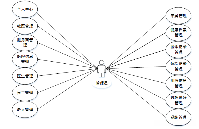 管理员登录后可进行个人中心、社区管理、服务商管理、医院信息管理、医生管理、员工管理、老人管理、亲属管理、健康档案管理、就诊记录管理、体检记录管理、用药信息管理、兴趣爱好管理、系统管理,管理员的用例如图3-1所示。
