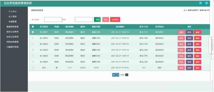 健康档案管理:通过列表可以获取老人姓名、性别、既往疾病、病史、康复计划、登记时间、医生工号、医生姓名等信息,进行查看、修改、删除操作,如图5-7所示。