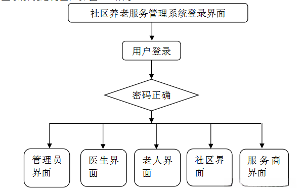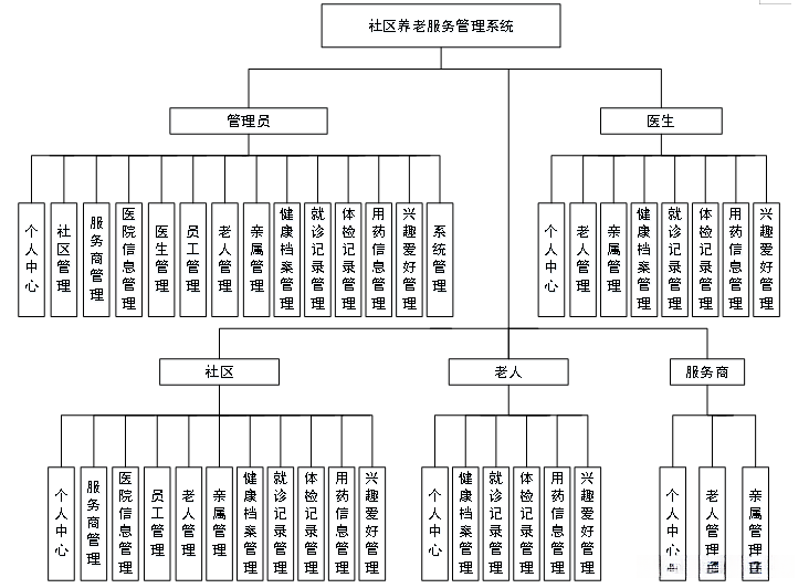 使用社区养老服务管理系统的用户分为管理员和医生、老人、社区、服务商五个权限子模块。
