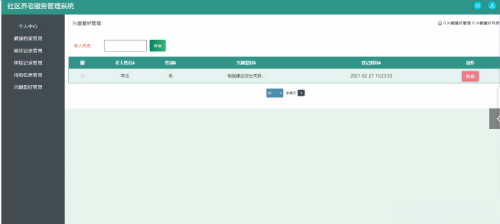 兴趣爱好管理:通过列表可以获取老人姓名、性别、兴趣爱好、登记时间等信息,进行查看等操作,如图5-11所示。