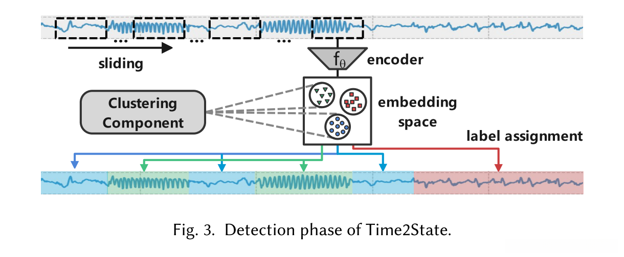一旦编码器训练完成,我们在检测阶段使用滑动窗口,以步长𝑠在整个时间序列上滑动,并计算每个窗口中数据的表示。最后,我们从低维嵌入空间中识别这些表示中的聚类结构,并将聚类标签分配给原始时间点。分配给每个时间点的最终标签是基于标签的多数投票,这也有助于消除少量潜在的错误 不正确的点标签。