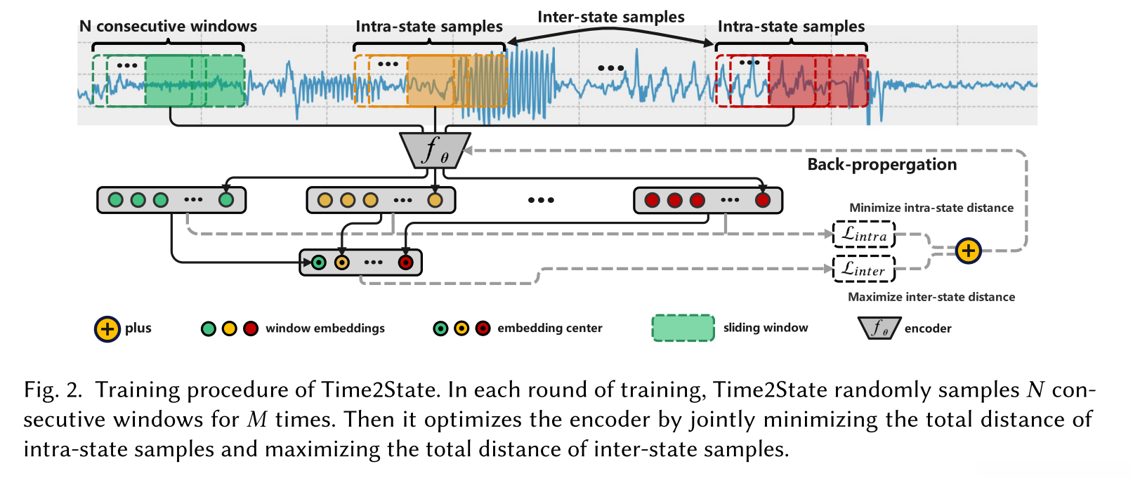 在训练阶段,我们训练编码器从原始时间序列中学习可区分的表示。两种观察:1)如果每个窗口都有一个状态,那么连续N窗口形成一个长度N的状态序列,其中这些N状态可能是相同的。我们称N状态内样本。状态内样本的表示在嵌入空间中应该是接近的。