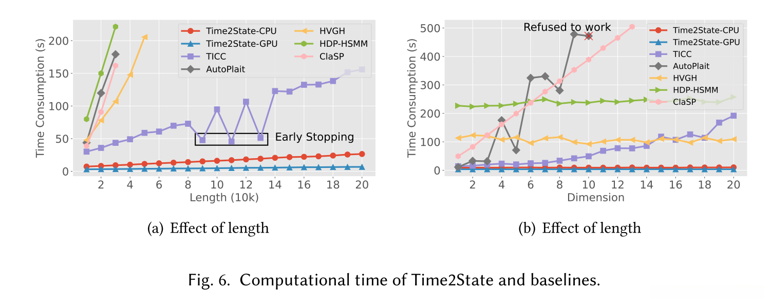 为了验证长度的影响,我们将尺寸固定为4,并将长度从10k变化为200k;为了验证尺寸的效果,我们将长度固定为30k,并将尺寸从1更改为20。如图6(a)所示,随着时间序列长度的增加,Time2State的计算时间呈线性增长,且增长速度远慢于基线。如图6(b)所示,随着维数的增加,Time2State、HDP-HSMM和HVGH的计算时间变化不明显。这是因为这些方法没有考虑不同通道之间的相关性。