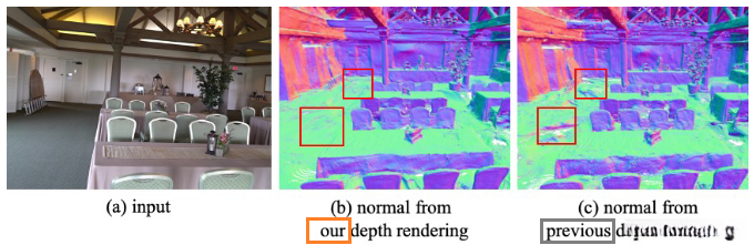 Our rendered depth is theintersection point of rays and surfaces, matching the actual surface. In contrast, the depth from previous methods corresponds to a curved surface and may deviate from the actual surface.