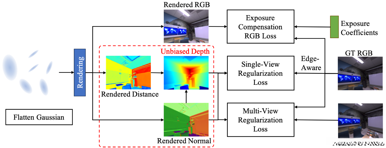 We then incorporate single-view and multi-view geometric regularization, and exposure compensation model to achieve precise global consistency in geometry.