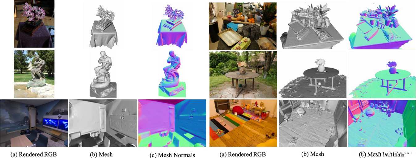 The rendering and mesh reconstruction results in various indoor and outdoor scenes that we have achieved.