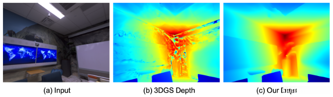 (b) We use true depth to supervise two different depth rendering methods. After optimization, we map the positions of all Gaussian points.