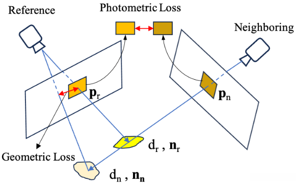 We then introduce single-view geometric , multi-view photometric , and geometric regularization to preserve global geometric accuracy.