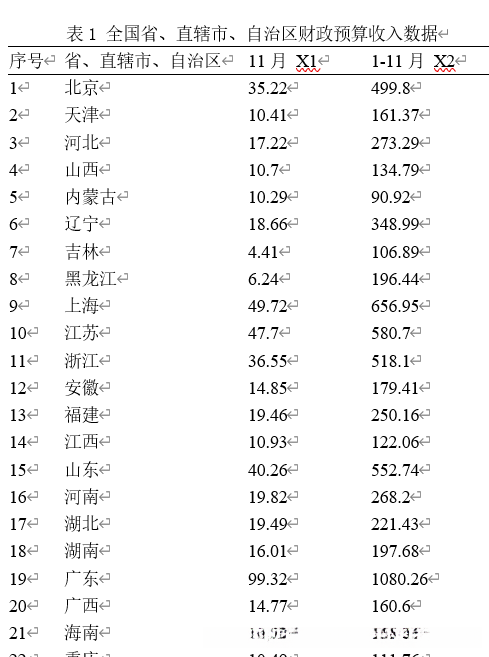 2002年11月以及1至11月全国省、直辖市、自治区财政预算收入数据如表1所示,设X1为11月预算收入,X2为1至11月预算收入,分别对X1,X2的观测值计算: