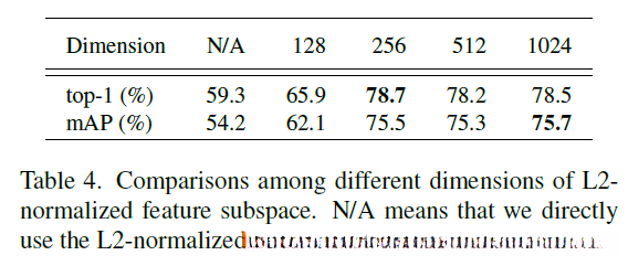 在表格中标记为N/A的部分表示直接应用了L2正则化后得到的2048维特征向量即未将这些特征映射至低维子空间通过观察可以看出这样的处理方式会导致效果最为糟糕这进一步验证了在经过L2正则化的条件下将特征投射至低维子空间对于后续分析具有重要意义在实验过程中发现 在不同维度(从256到1024)之间测试结果显示相近的效果 最终研究确定将特征投影至一个包含 个维度的空间以实现降维目标
