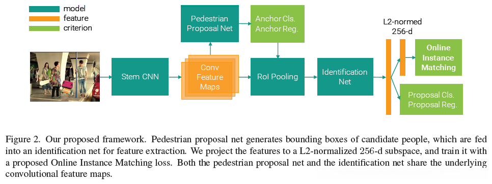 与传统方法中将行人检测与目标再识别视为两个独立的问题分别研究不同,在本文中我们提出了一种基于单一卷积神经网络(CNN)的集成方法。该网络由两个主要模块组成:其中一部分是 pedestrian detection module( pedestrian proposal net),其接受一张完整的行人图像作为输入,并生成一系列候选框( bounding boxes)。这些候选框随后被传递至 identification module 进行特征提取,并通过 joint optimization 方法实现目标人物的身份匹配。另一部分为 identification module(目标再识别网),其主要功能是提取行人的特征并完成身份匹配任务。在这一联合优化过程中,两模块展现出良好的相互适应性:pedestrian detection module 侧重于高召回率(Recall),旨在尽可能多地捕获所有相关行人;而 identification module 则专注于精确匹配以避免误判。为了进一步提升整体性能,在设计网络架构时我们采用了共享卷积层策略以减少计算开销