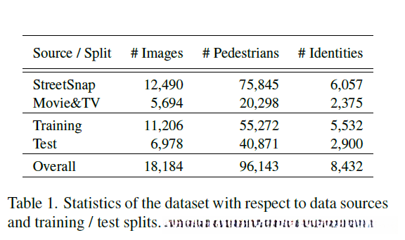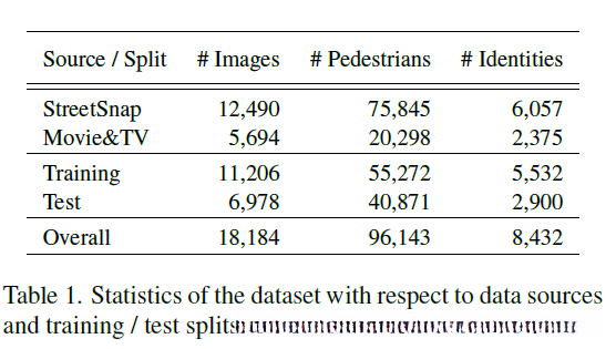 本文第三项主要贡献是系统性地收集与标注了一个规模宏大的行人搜索数据集;这些数据集涵盖了城市街道的各种场景以及从电影中提取的人像截取样本。为了增强样例的多样性,在表1中展示了该数据集的具体信息:包括18,184张图片、8,432个身份(人)和96,143个行人bounding boxes。
