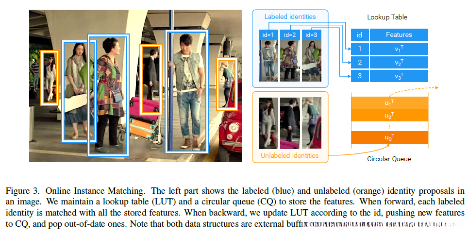 在mini-batch中对每个带有标签的身份(即labeled identity)进行特征提取时会得到一个特征向量x(其维度为D)。随后会创建一个查找表V(也称为 Lookup Table, LUT),如图3右上方所示的那个蓝色方块区域。这个查找表V的作用就是负责存储每个带有标签身份的所有特征信息。它是一个二维矩阵(即V是一个D \times L维矩阵),其中D表示单个带有标签身份特征向量的空间维度数;而L则代表不同身份的数量。因此整个查找表V的空间维度数就等于D \times L。