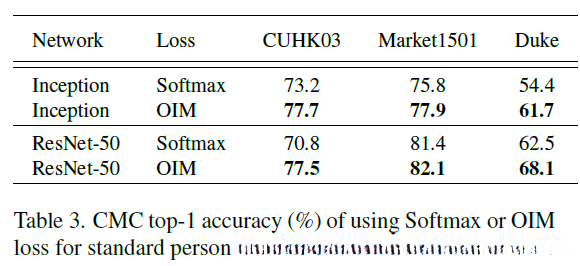 如下表Table 3所示,在所有相关数据集上进行评估时无论是选用Inception模型还是Resnet50作为base CNN,OIM损失始终优于softmax损失。